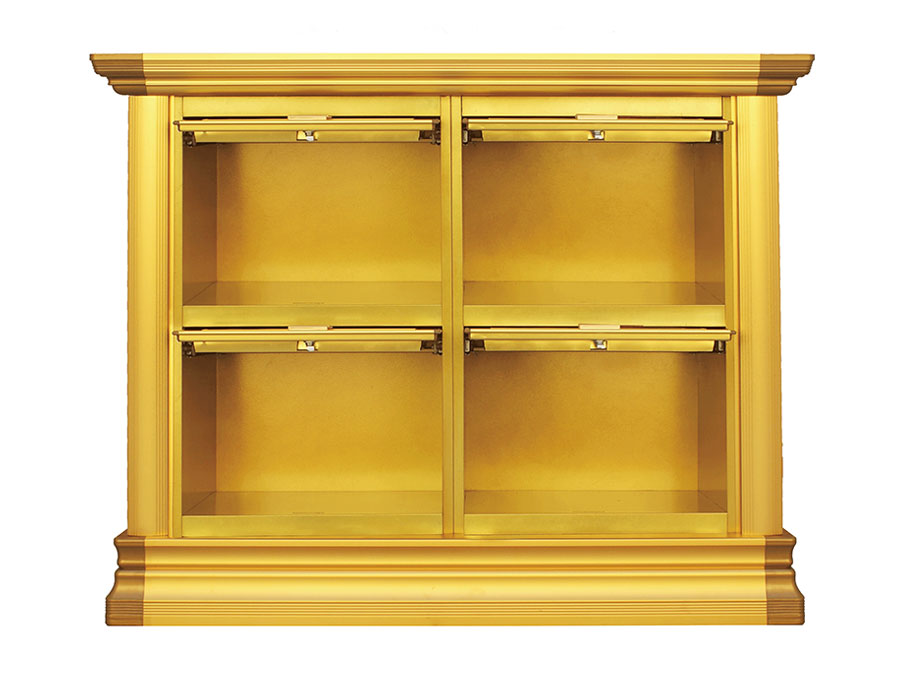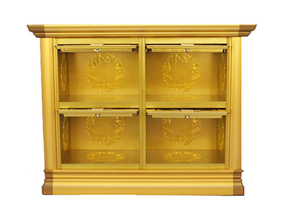 骨灰存放架是由箱體、面板、側(cè)板、頂蓋、底座、轉(zhuǎn)角、封板等構(gòu)成,以及佛臺(tái)、掛落、佛 龕等相關(guān)配件構(gòu)成。 箱體:分鍍鋅板、不銹鋼板、鋁板等五金板材箱體,鋁合金中空板扣接式箱體和純鋁壓鑄型 箱體。 面板:面板根據(jù)工藝不同、材料不同,風(fēng)格各異、大不相同,既要起到美觀易分類作用,又 要起到防火、防塵、防潮、防蟲(chóng)等作用。 側(cè)板:用于裝飾和保護(hù)箱體側(cè)面的作用,又可根據(jù)現(xiàn)場(chǎng),對(duì)存放架分類的標(biāo)識(shí)作用,一目了 然方便管理。 頂蓋、底座:都是穩(wěn)固整列和整排箱體水平線,底座還起到一部分承重作用。 轉(zhuǎn)角、封板:箱體轉(zhuǎn)彎處和空隙處塑形的作用。 佛臺(tái):由幾個(gè)骨灰存放架組成一個(gè)小型佛龕臺(tái),用于放置佛像。 佛龕、掛落:整排存放架為了劃分區(qū)域,在每個(gè)區(qū)域靠墻上方,設(shè)置小型佛龕,為了美觀, 加上掛落。