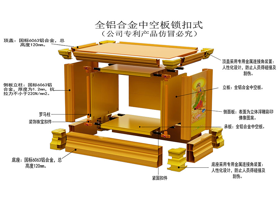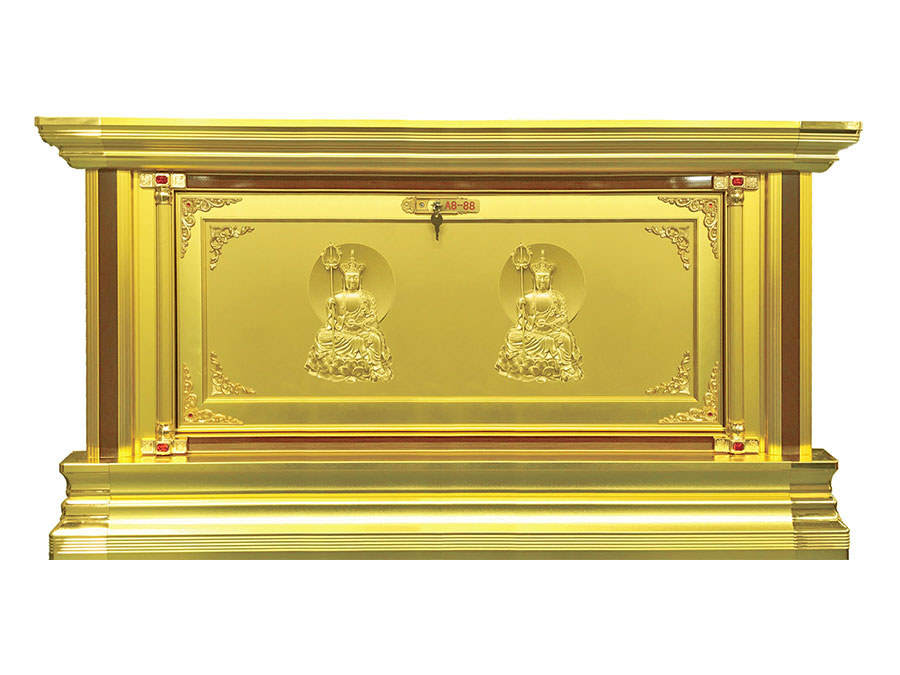 骨灰存放架是由箱體、面板、側板、頂蓋、底座、轉角、封板等構成,以及佛臺、掛落、佛 龕等相關配件構成。 箱體:分鍍鋅板、不銹鋼板、鋁板等五金板材箱體,鋁合金中空板扣接式箱體和純鋁壓鑄型 箱體。 面板:面板根據工藝不同、材料不同,風格各異、大不相同,既要起到美觀易分類作用,又 要起到防火、防塵、防潮、防蟲等作用。 側板:用于裝飾和保護箱體側面的作用,又可根據現場,對存放架分類的標識作用,一目了 然方便管理。 頂蓋、底座:都是穩固整列和整排箱體水平線,底座還起到一部分承重作用。 轉角、封板:箱體轉彎處和空隙處塑形的作用。 佛臺:由幾個骨灰存放架組成一個小型佛龕臺,用于放置佛像。 佛龕、掛落:整排存放架為了劃分區域,在每個區域靠墻上方,設置小型佛龕,為了美觀, 加上掛落。