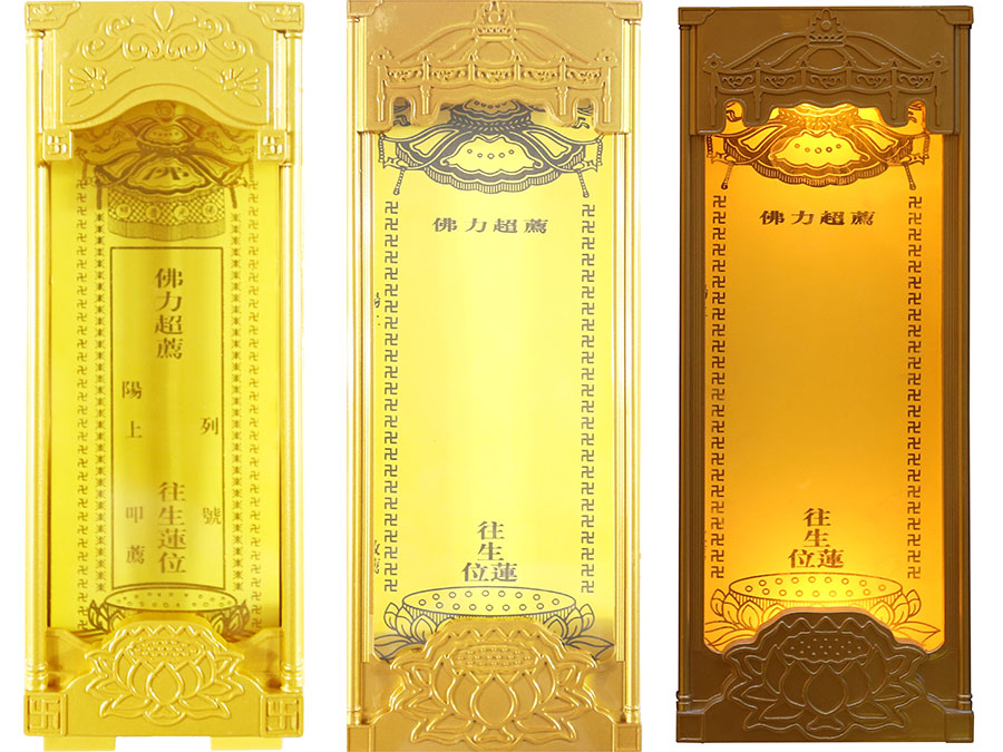 長往生牌位是由盒體、門板、側板、頂蓋、底座、轉角、地臺、封板等構成。