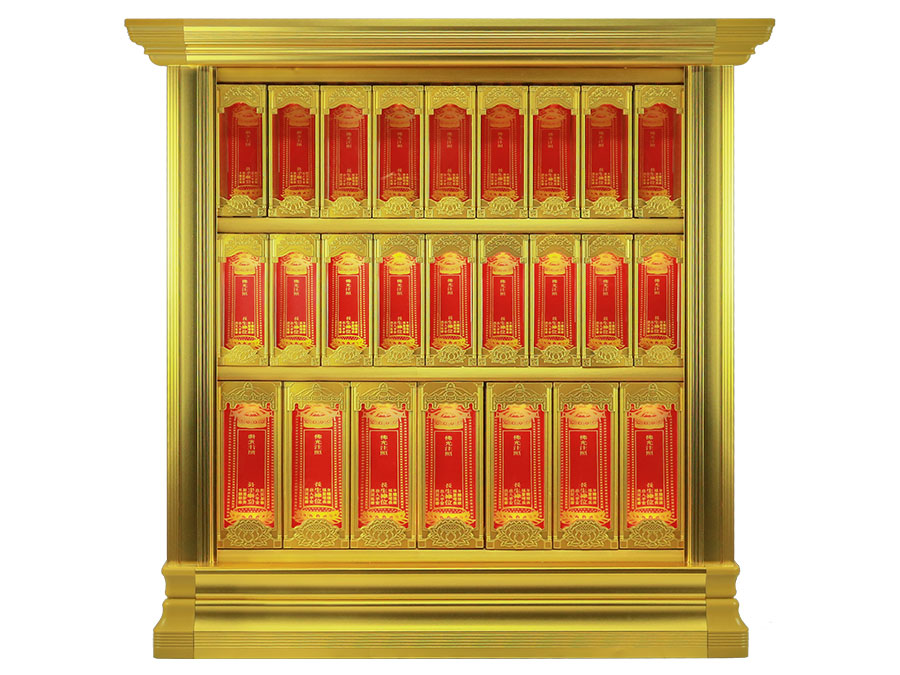 長往生牌位是由盒體、門板、側板、頂蓋、底座、轉角、地臺、封板等構成。